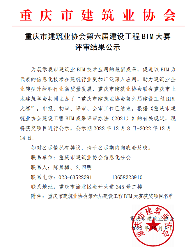 近日,由重庆市建筑业协会联合重庆市土木建筑学会共同主办的“重庆市建筑业协会第六届建设工程BIM大赛”评审结果揭晓,凭借BIM技术与全过程造价咨询的创新融合,168飞艇开奖官网直播记录参与的“重庆龙兴足球场BIM全过程造价管理项目”荣获综合BIM技术应用二等奖。