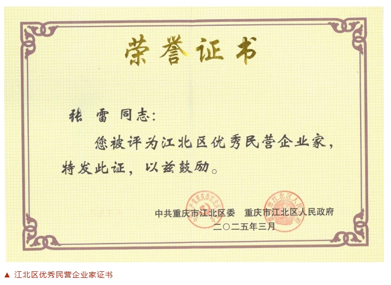 近年来,张雷董事长带领企业及全体员工坚持以习近平新时代中国特色社会主义思想为指导,深入落实习近平总书记视察重庆重要讲话指示精神,以敢闯敢拼的魄力锚定发展坐标,以求新求变的智慧破局行业变革,以实干笃行的韧劲深耕城市沃土,在推动江北区经济发展中发光发热,书写着新时代民营企业的担当作为。