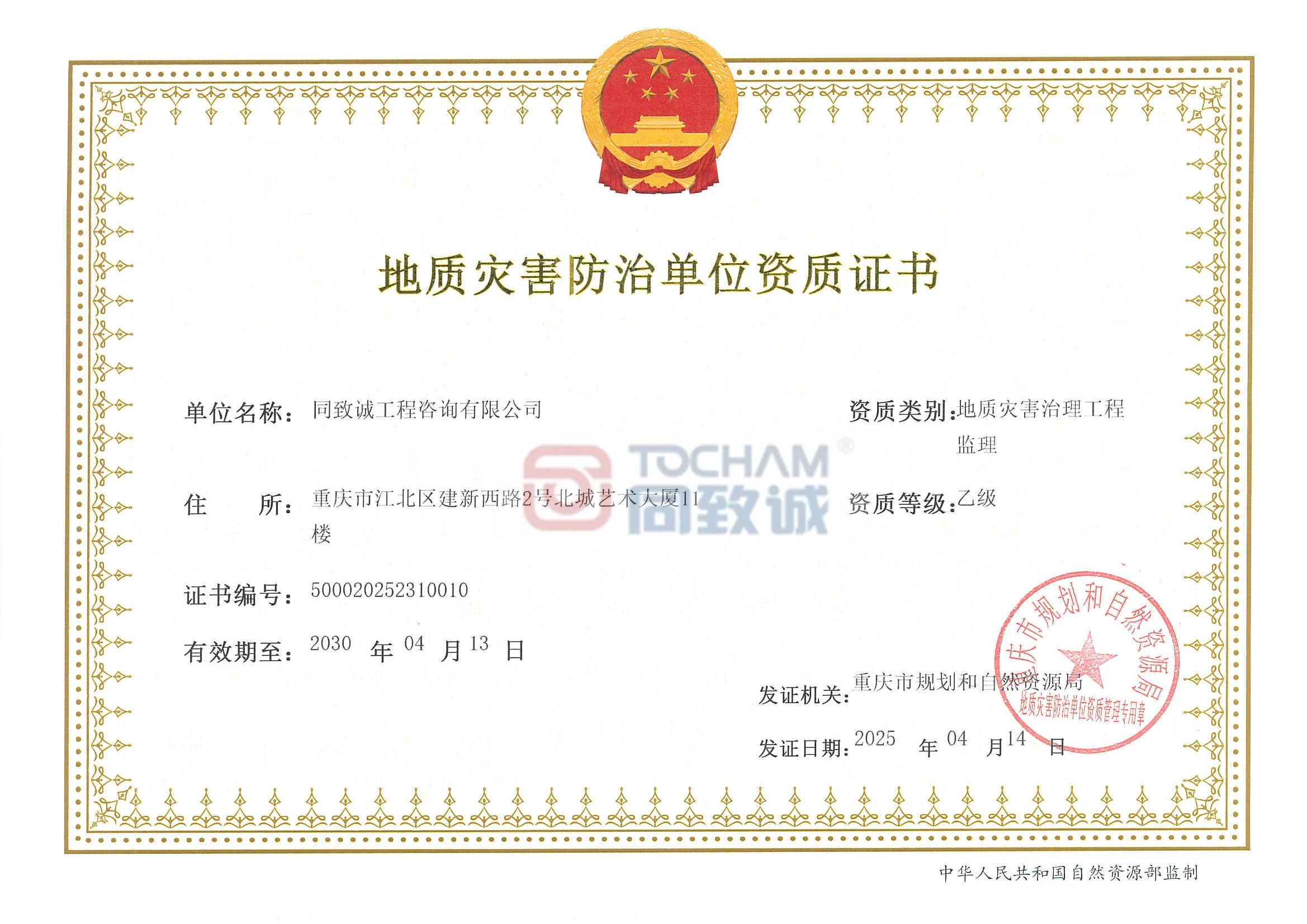 近年来,公司不断加强资质规划和建设,坚持市场需求导向,充分发挥监理优势,积极申报规划相关资质,不断优化资质体系。该资质的取得不仅是对同致诚技术实力、管理体系与项目经验的全面肯定,同时弥补了公司地质灾害治理工程监理资质的空白,拓展了地质灾害防治工程业务产业链。