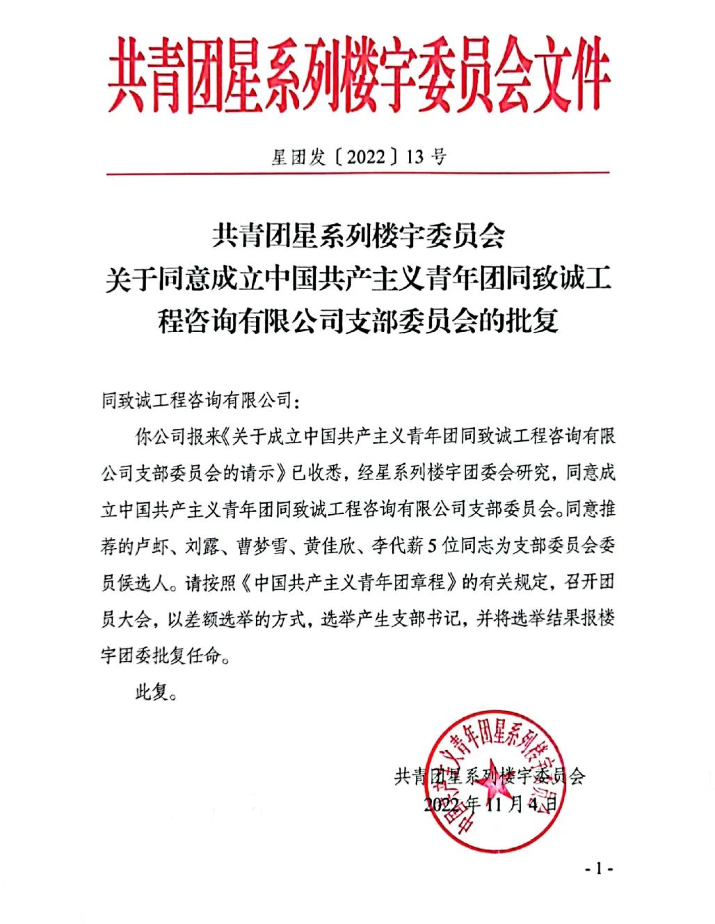 同致诚第一次团员大会上,首先宣读了共青团星系列楼宇委员会《关于同意成立中国共产主义青年团168飞艇开奖官网直播记录支部委员会的批复》。随后,与会团员以无记名差额选举的方式投票产生了第一届支部委员会成员,由卢虾同志任书记,刘露同志任组织委员,曹梦雪同志任宣传委员,黄佳欣同志任纪检委员,李代薪同志任青年委员。