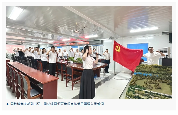 随后,大家前往项目部开展主题座谈会。会前,大家面对鲜红的党旗,庄严地举起右手,用洪亮的声音重温入党誓词,彰显永恒初心,表达出身为新时代党员的责任和担当。在主题交流环节,与会各单位领导、党员代表结合自身实际,围绕岗位职责、党员初心、党纪学习等展开交流,分享感悟,畅谈体会。