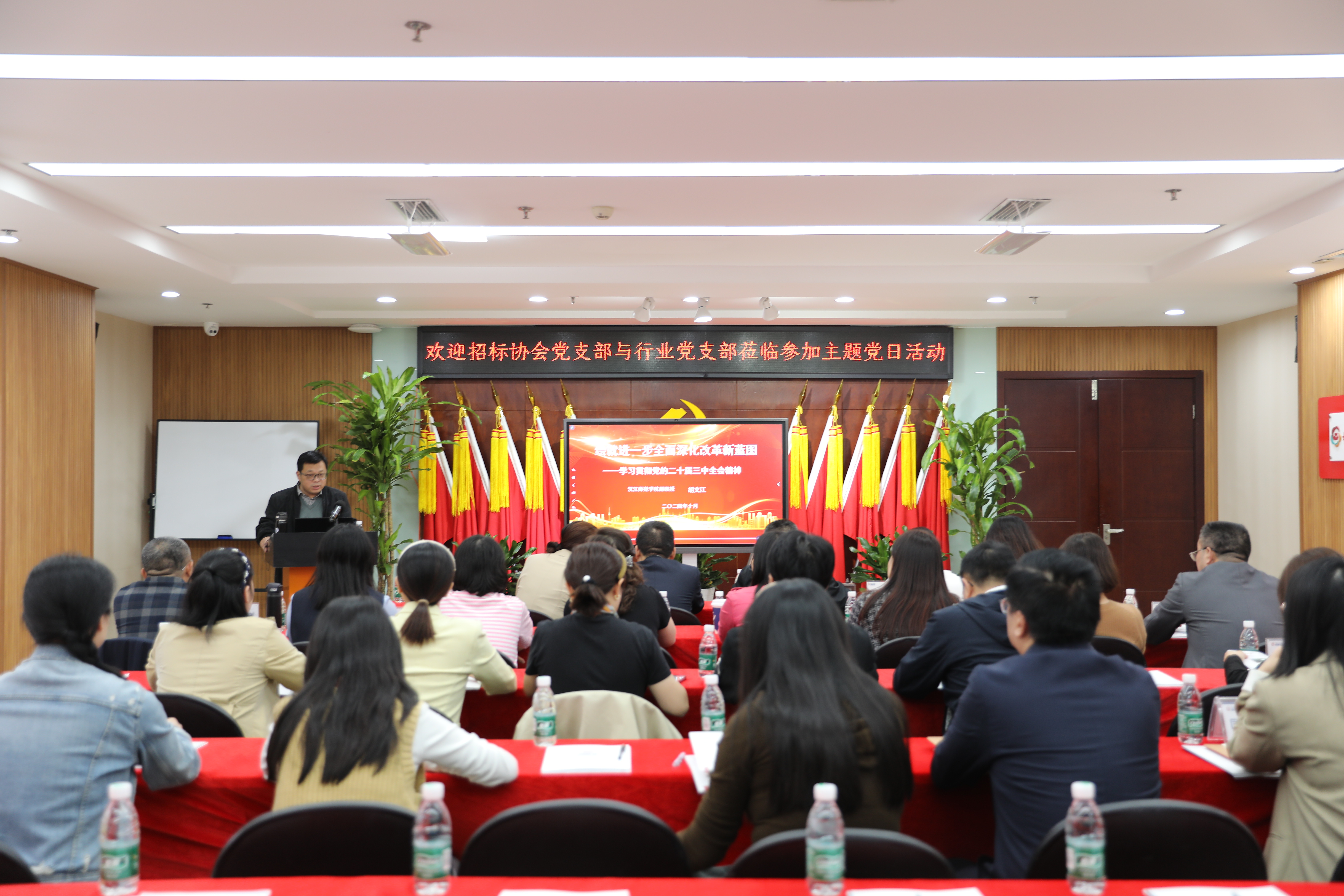 接着,胡教授以“绘就进一步全面深化改革新蓝图”——学习贯彻党的二十届三中全会精神为题,为大家亲授党课。胡教授讲到,党的二十届三中全会是在以中国式现代化全面推进强国建设、民族复兴伟业的关键时期召开的一次十分重要的会议。并通过国内外形势和国内大循环等不同角度阐述我国进一步全面深化改革的重要性和党中央对新时代改革开放和社会主义现代化建设的深远考量。同时,胡教授还结合招投标行业的特点,从营商环境、党建促会建、党建促业务、党建聚人心等方面进行剖析,如何让我们的市场主体在社会主义市场经济这个大背景之下能够茁壮成长,让优质生产力能有更多的成长机会。他的精彩讲解,使在场的党员同志们深受启发,进一步明确了今后的工作方向和奋斗目标。
