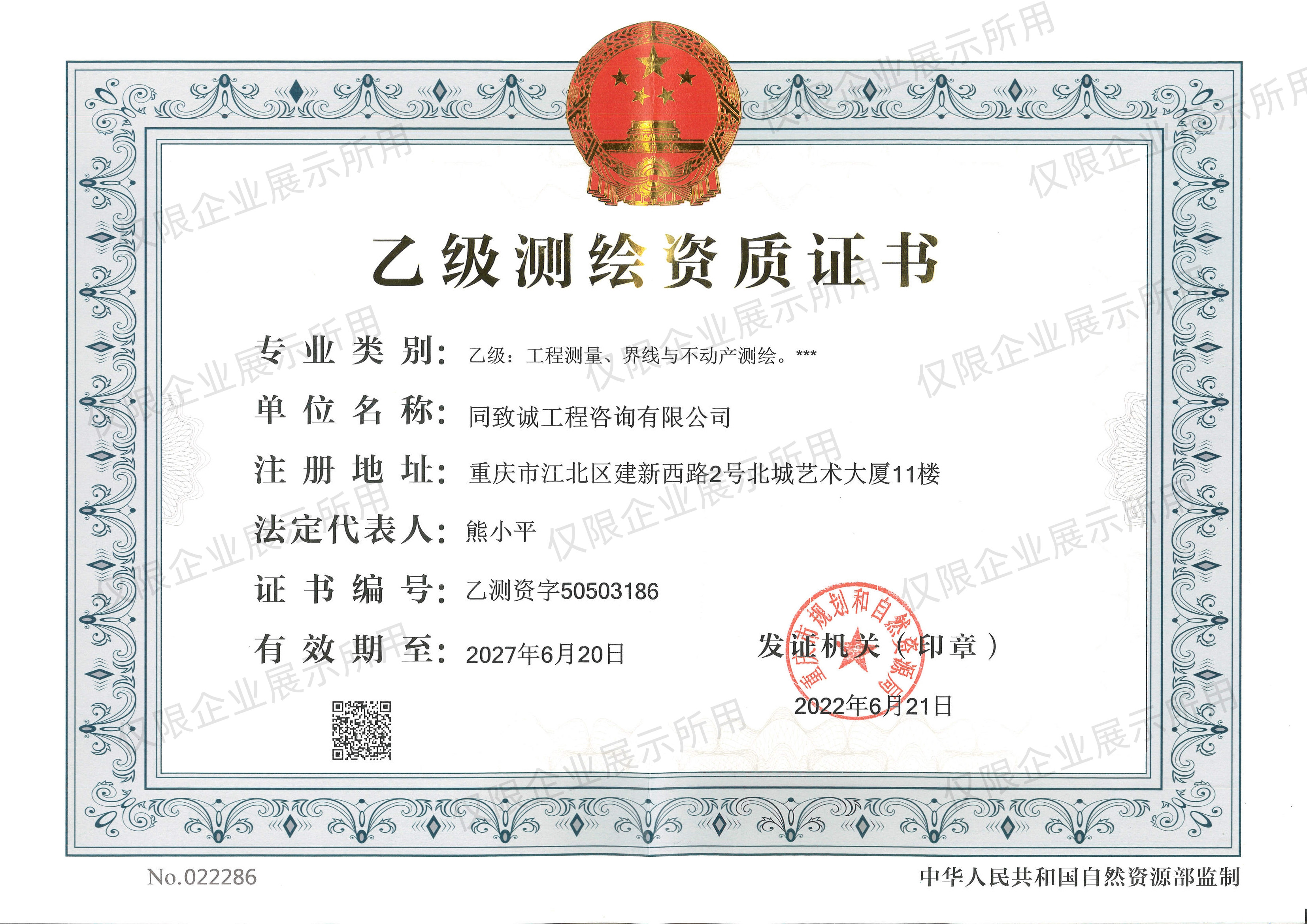 自准备申报测绘资质以来,公司积极梳理测绘人员,组织人员参加国家地理信息安全保密培训,查找公司的测量设备相关资料,完善测绘技术和质量保证体系,建立测绘地理信息安全保障措施和测绘成果和资料档案管理等制度,在人员、设备、制度、设施都做了充足准备,经过系统申报、严格审核等环节,最终经重庆市规划和自然资源局审批通过后颁发证书。