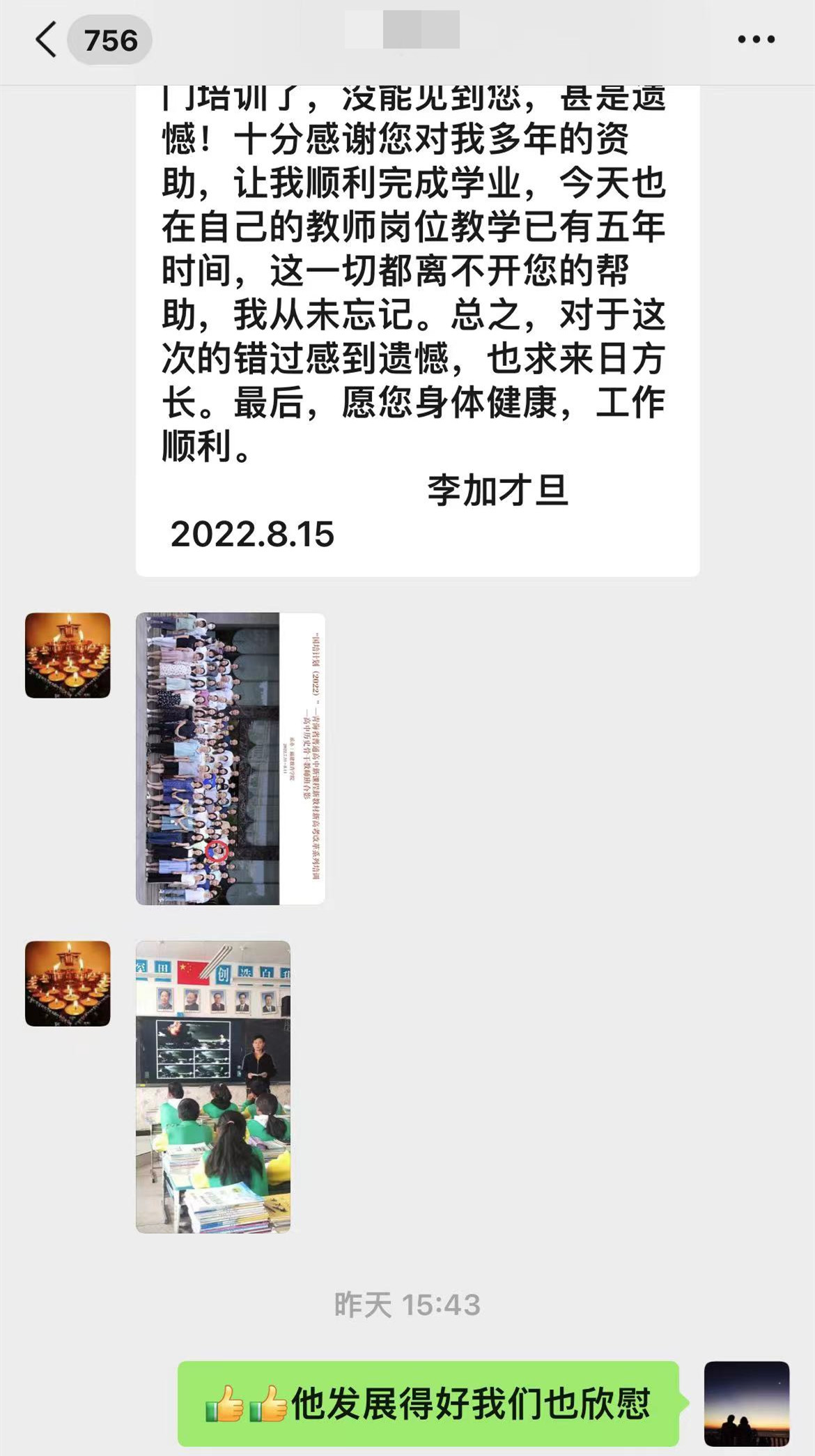 信中提及他毕业后,成为了一名历史老师,从事教育行业已有5年时间。看到他的发展,我司倍感欣慰,希望他在自己的岗位上继续发光发热,把知识传授给学生,为祖国培育更多的人才,反哺社会,回报家乡。