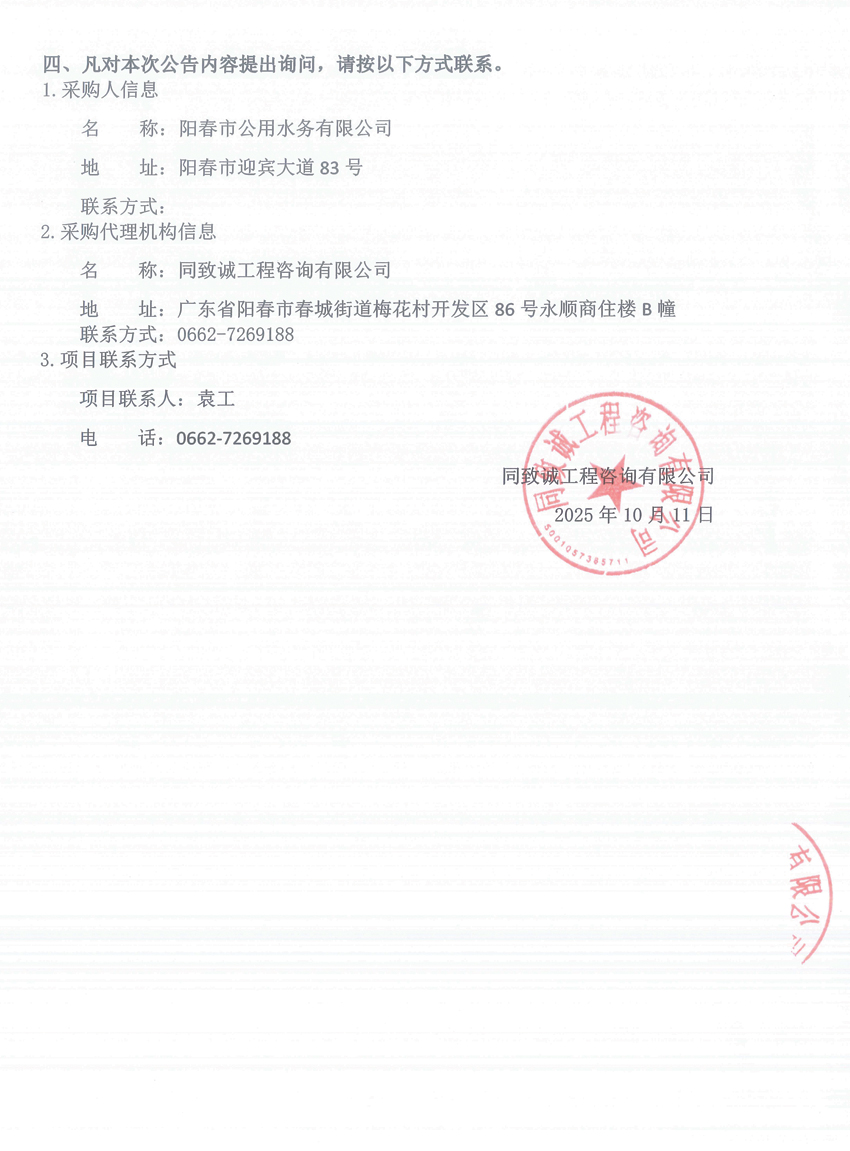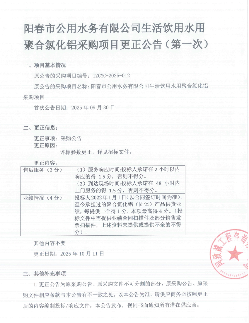 阳春市公用水务有限公司生活饮用水用聚合氯化铝采购项目更正公告(第一次)