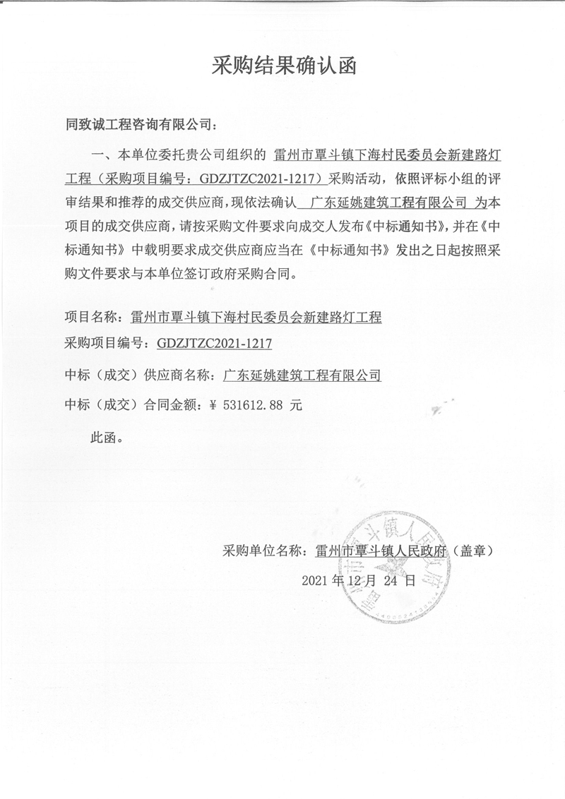 雷州市覃斗镇下海村民委员会新建路灯工程 采购确认函